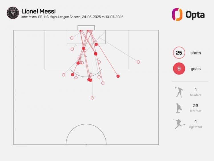 7月10日讯 梅西最近状态火热,在美职联大杀四方。据Opta数据统计,梅西在美职联过去5场比赛中共完成了25次射门,其中9次射正全部转化为进球。